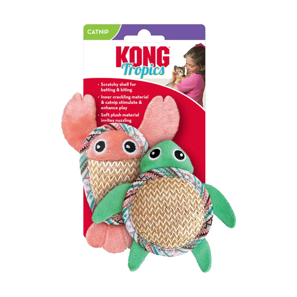 Este pack de Kong Tropic Pals lleva una tortuga y un cangrejo de tela rellenos de hierba gatera.